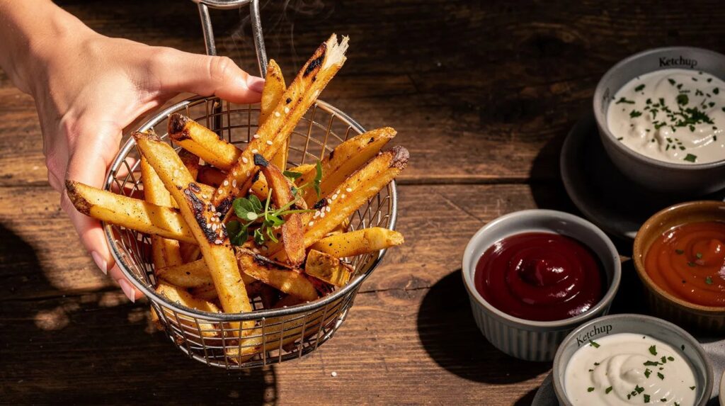Die Bandbreite ist größer als oft angenommen: Pommes frites, Hähnchen, Fisch, Gemüse, Tofu, aber auch Muffins, kleine Quiches, Toast oder aufgebackene Croissants funktionieren gut. Im Frühjahr eignen sich Spargel, junge Möhren oder Zuckererbsen besonders gut — das Gargut bleibt bissfest und bekommt eine leichte Röstaromenote, die im Backofen erst nach deutlich längerer Zeit entsteht.