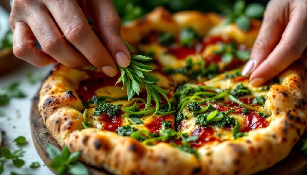 Den Bärlauch erst in den letzten zwei Backminuten auflegen, wenn man ein maximal frisches, fast rohes Aroma bevorzugt. So behält das Blatt seine leuchtende Farbe und gibt nur einen Hauch Wärme ab. Wer es intensiver mag, legt ihn von Anfang an auf und lässt ihn vollständig zusammenfallen.