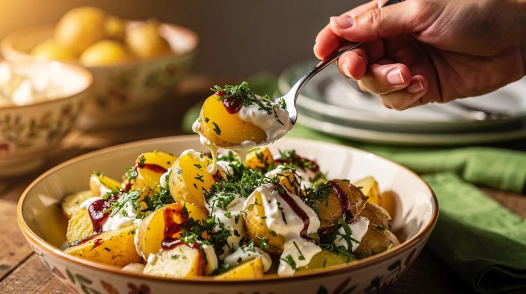 Die Brühe ist keine Nebensache. Ein schwäbischer Kartoffelsalat lebt von ihrer Tiefe: Wer Fleisch isst, verwendet die Brühe vom Osterbraten – das verbindet die Gänge auf dem Teller auf eine Art, die kein Gewürz ersetzen kann. Für eine vegane Version lohnt sich eine selbst gezogene Gemüsebrühe mit Sellerie, Porree und einer getrockneten Tomate, die die nötige Umami-Note liefert. Und wer den Essig gegen milden Apfelessig tauscht, bekommt eine etwas rundere, weniger scharfe Säure – passend, wenn Kinder am Tisch sitzen.