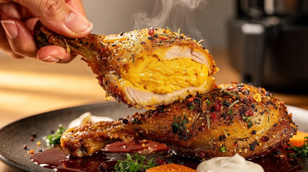 Wenn die ersten Frühlingstage die Küche wieder zum Leben erwecken und man nach einem langen Wintertag endlich wieder Lust auf etwas Leichtes, aber Befriedigendes verspürt, landet man unweigerlich beim Hähnchen. Knusprig soll es sein, goldbraun, mit einer Haut, die beim ersten Biss hörbar splittert — und das alles ohne eine einzige Tropfen Frittieröl. Der Airfryer macht das möglich, doch der eigentliche Unterschied zwischen einer mittelmäßigen Hähnchenkeule und einer, die an Brathähnchen vom Drehspieß erinnert, liegt in einem einzigen Pulver, das fast jeder im Küchenschrank hat: Backpulver.