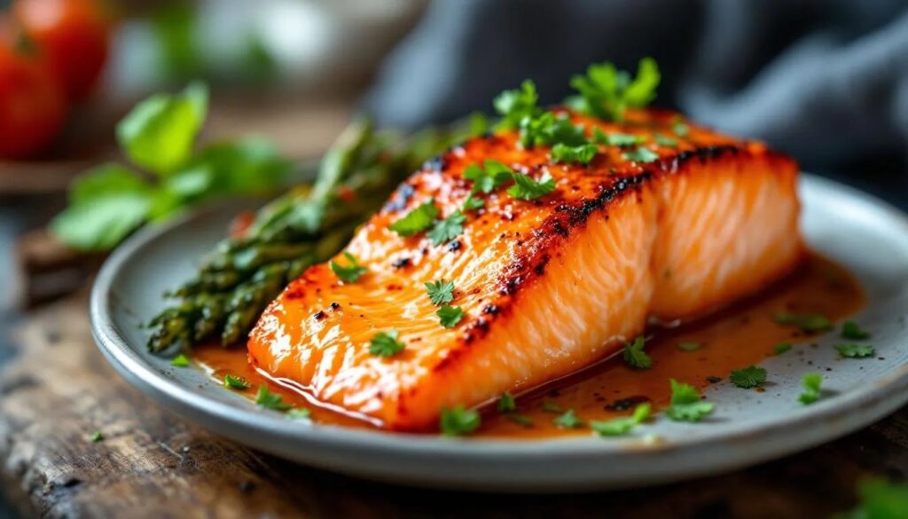 Die Methode funktioniert mit nahezu jedem fettreichen Fisch. Forelle – im Frühling besonders frisch verfügbar – reagiert ähnlich wie Lachs auf den heißen Luftstrom, benötigt aber nur 6 Minuten bei gleicher Temperatur. Kabeljau oder Heilbutt sind magerer und trocknen schneller aus: Hier empfiehlt sich eine Reduzierung auf 180 °C und eine großzügigere Marinade. Wer den Honig ersetzen möchte, greift zu Ahornsirup oder weißem Miso, das eine tiefere, umami-betonte Karamellisierung erzeugt. Im Sommer kann Dill durch frischen Estragon ersetzt werden, im Herbst passt Thymian besser zum Fisch als Kräuterakzent.