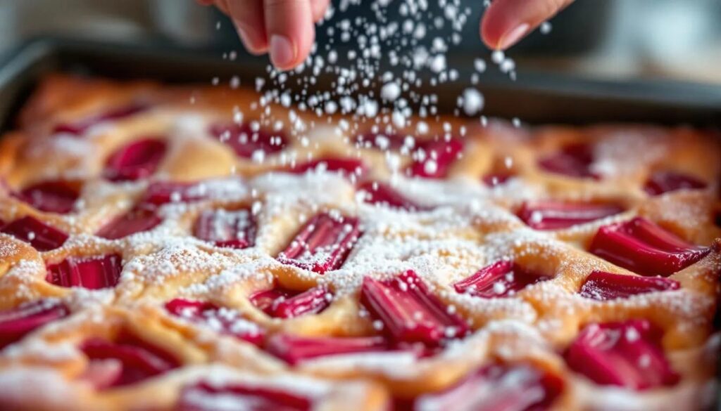 Das Blech in den vorgeheizten Ofen schieben, mittlere Schiene, und 18–22 Minuten backen. Nach 18 Minuten die erste Kontrolle: Der Teig rund um den Rhabarber sollte goldgelb und an den Rändern leicht gebräunt sein. Die Stäbchenprobe – ein Holzstäbchen senkrecht in den Teig stechen, nicht in den Rhabarber – zeigt, ob das Innere gar ist: klebt kein Teig mehr am Stäbchen, ist der Kuchen fertig. Wer möchte, schaltet in den letzten 2 Minuten auf Oberhitze oder Grill, um den Rhabarber oben leicht zu karamellisieren. Nach dem Backen kurz auf dem Blech abkühlen lassen, dann mit einem Sieb Puderzucker über die gesamte Fläche stäuben.