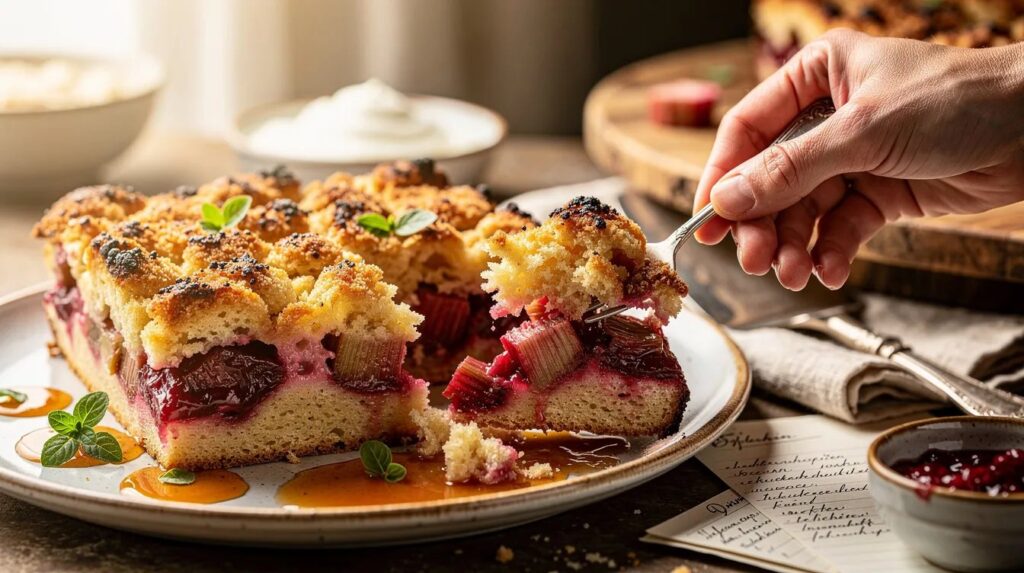 Streuselkuchen selbst hat tiefe Wurzeln in der schlesischen Backkultur und breitete sich über Generationen von Vertriebenen und Auswanderern in ganz Deutschland aus. Die Kombination aus Rhabarber und Streusel ist dabei regional unterschiedlich: In manchen Gegenden wird unter die Rhabarberfüllung ein Guss aus Ei, Sahne und Zucker gegeben, der beim Backen stockt und die Füllung bindet – ähnlich wie bei einem Quicheprinzip. Die hier vorgestellte Version ohne Guss ist schneller, weniger aufwändig und betont die natürliche Textur des Rhabarbers stärker.